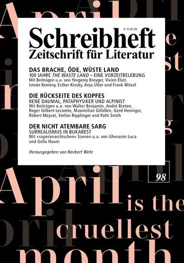Mit Beiträgen und Übersetzungen von Yevgeniy Breyger, Ernst Robert Curtius, Georg Deggerich, T. S. Eliot, Vivien Eliot, Wolfgang Held, Ernst Jandl, István Kemény, Esther Kinsky, Anna-Nina Kroll, Maximilian Mengeringhaus, Ezra Pound, Gerhard Rühm, Gerd Schäfer, Rike Scheffler, Rainer G. Schmidt, Alfred Margul Sperber, Timea Tankó, Johannes Ungelenk, Anja Utler, Norbert Wehr und Frank Witzel